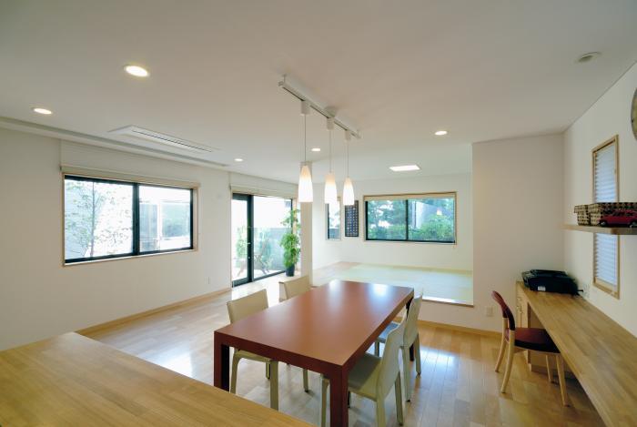 子世帯の広々としたリビングダイニング。小上がりの畳コーナーはゴロゴロするのに実に重宝なスペースとなってます。