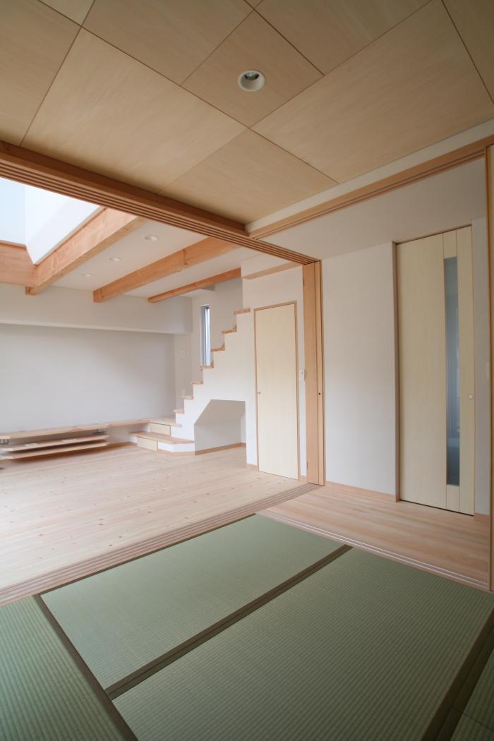 写真は、リビングと和室・廊下の建具をすべて開放したところ。