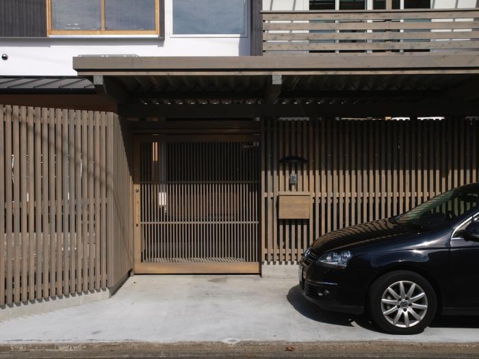 子世帯の玄関を南側の一方通行にとり、親世帯を西側の一方通行に面した玄関とした。