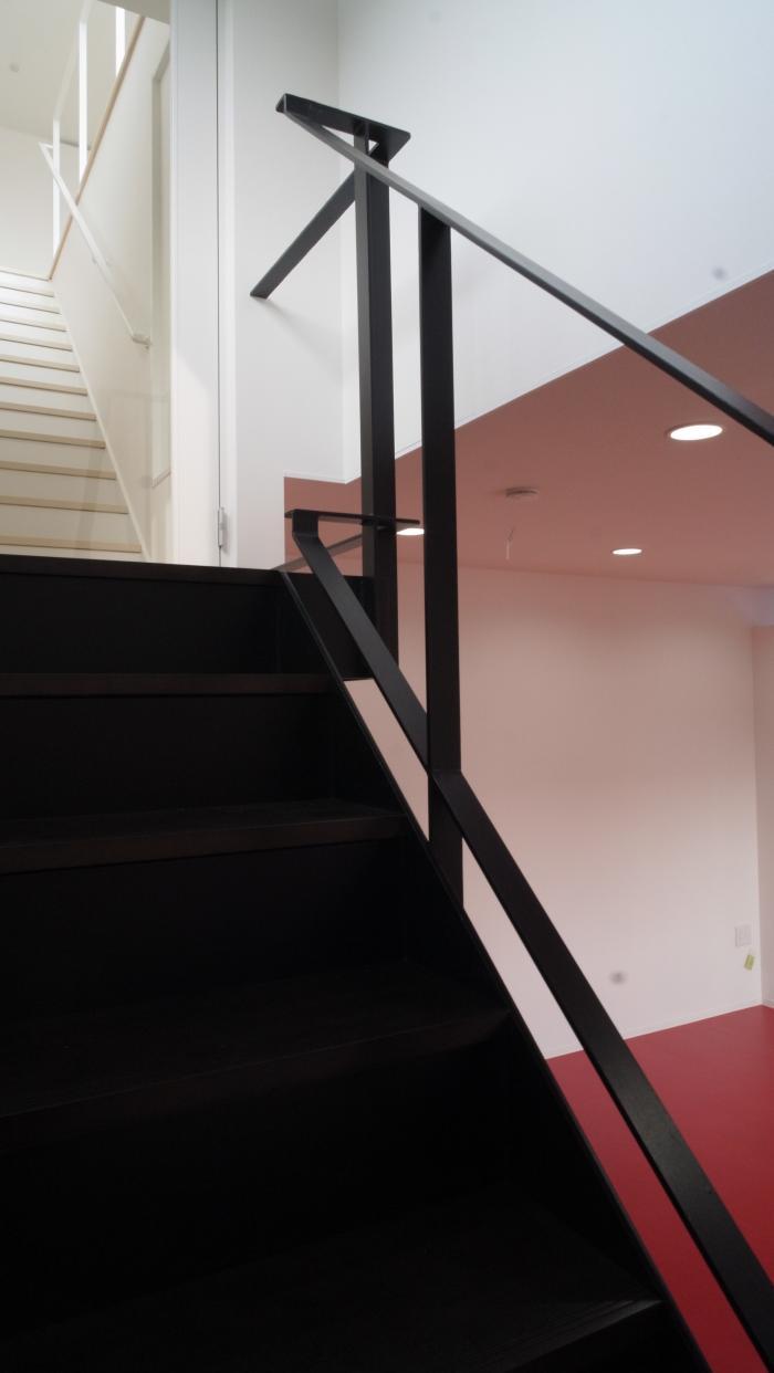 鉄骨の2階建てであるが、ほとんど3階建ての高さが必要で、長い階段となることを逆手に住宅の玄関としての機能を盛り込みました。又、3階建ての高さがあるテラスバルコニーなので、近隣から除かれる心配が無く、LDKと一体化した、開放的なテラスバルコニーとして設計できました。同様にバから直接出ることができるように、バスの位置を検討しています。単なる店舗併用住宅でなく、発展性のあるテラスバルコニーを提案できました。但し、予算は相当厳しく、予算調整に苦労しました