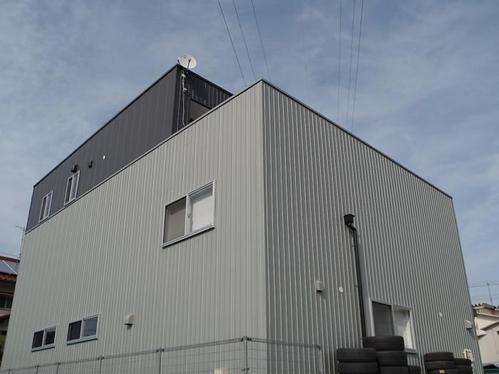 建物の全景です。修理工場と住居を、ありのままにシルバーと黒のガルバニウム鋼板のスパンドレルにて表現しています