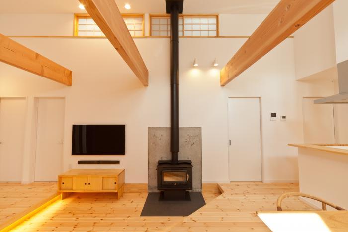 煙突の背面上部に見える障子はロフトからリビングを見下ろす窓。平屋の屋根のふところを有効活用。