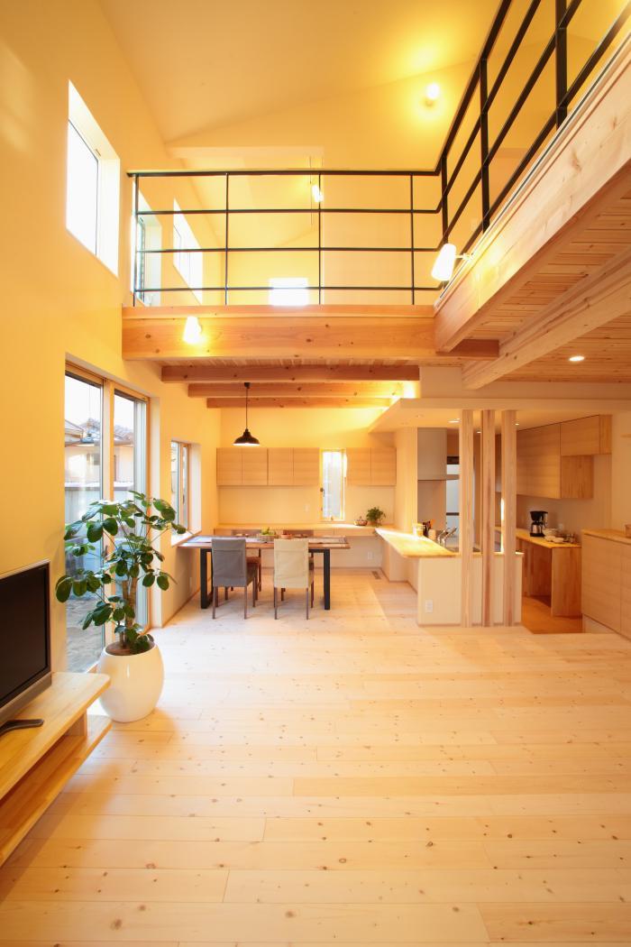 床や天井を無垢材で仕上げたリビングです。吹抜けのあるリビングを中心に各部屋を配置し、お互いの雰囲気を感じられる様な空間にしています。