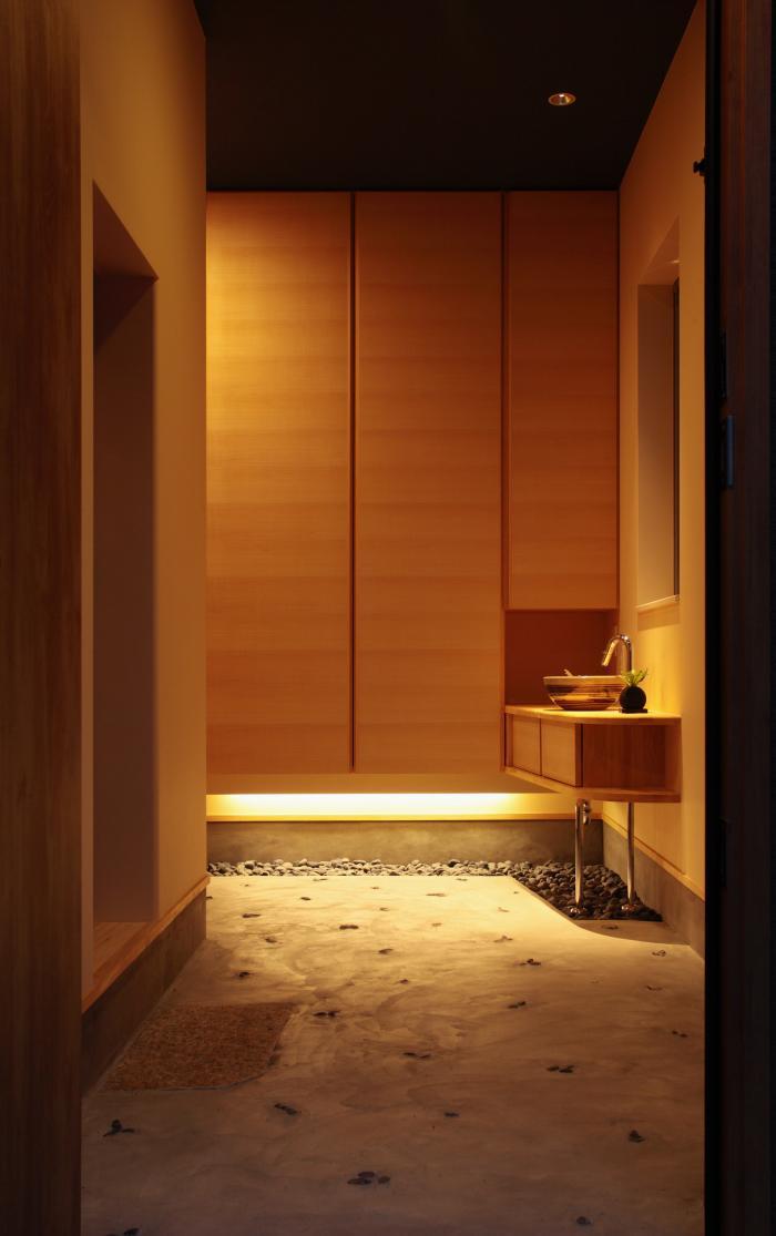土間風の玄関や無垢材をふんだんに使った内装で、見た目にも触覚的にもリラックス出来る空間になるように心がけて設計をしました。