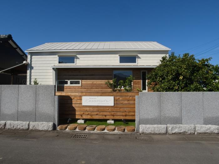 (3)存在感のある御影石の既存石塀とレモン・ユズ・キンカンの既存樹木を生かした外構計画