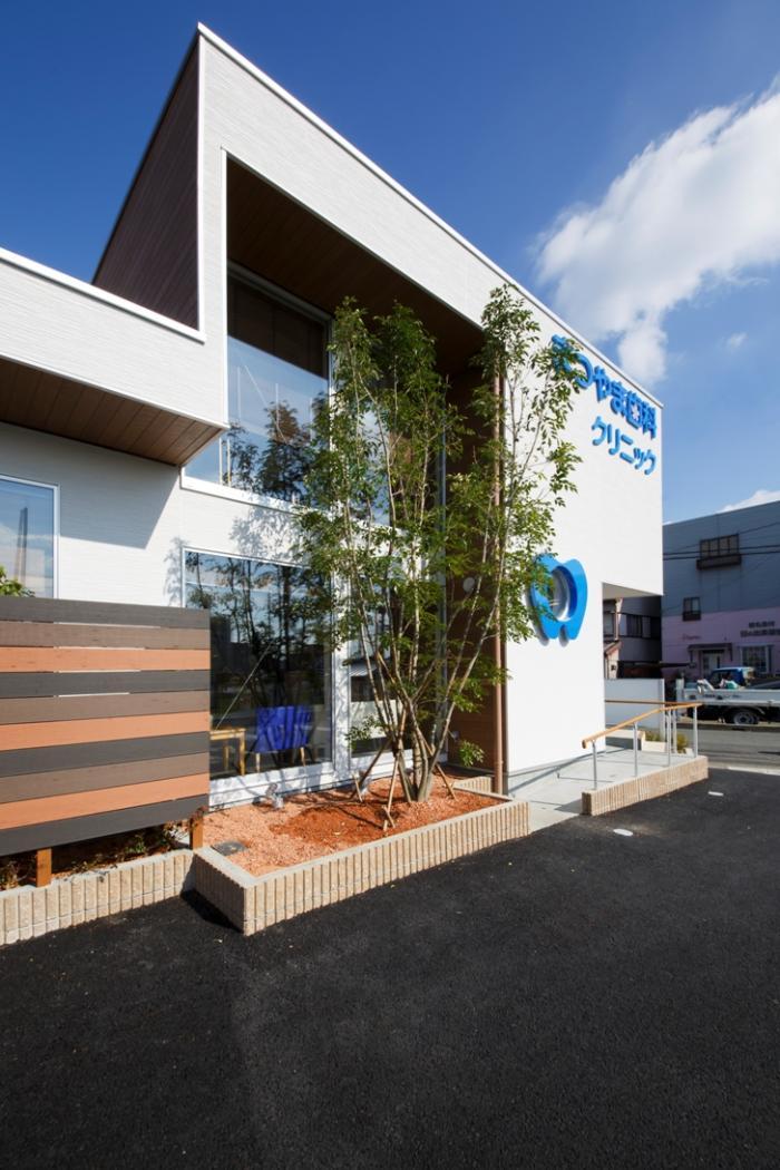 パーキングから見た、医院の全景です。待合室の十字になったガラス窓の外に、シンボルツリーを配置して