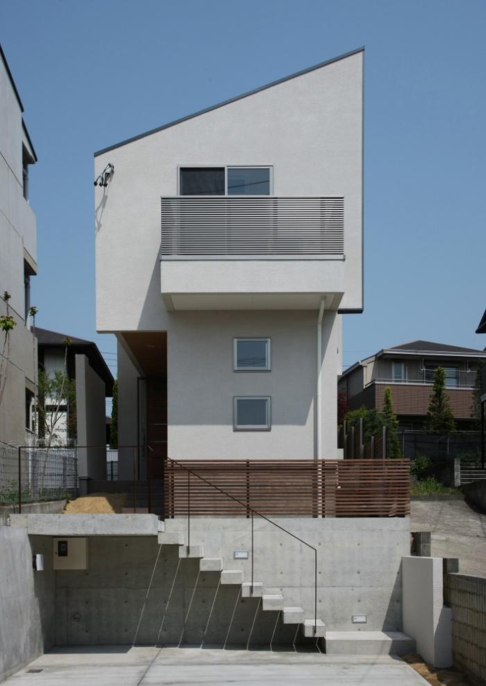 間口が5m、奥行が25m、道路との高低差が2m程度の敷地へ計画された間口3.6mの木造住宅です。