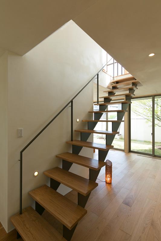二階からの光を誘導する、軽やかな階段。