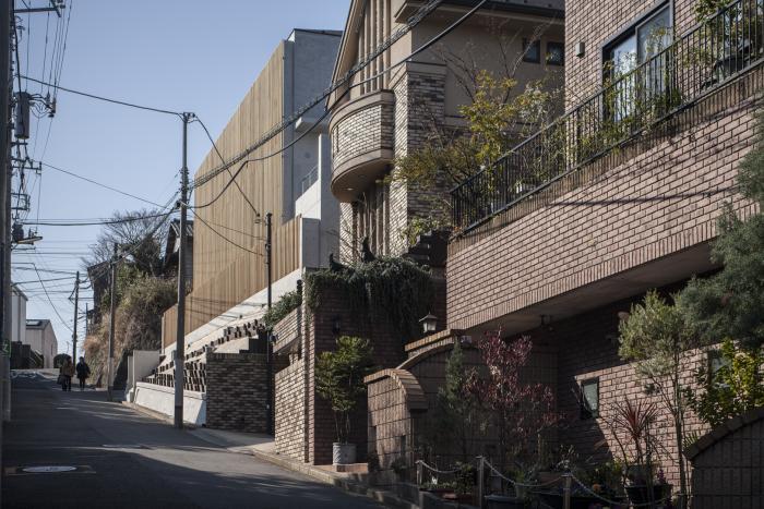 最寄り駅から建物に向かって歩いて観た建物。