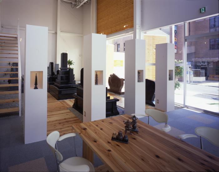 回遊性のあるショールームを提案しています。内装は自然素材を使い、床には杉の無垢材を貼り優しい空間を演出しています。