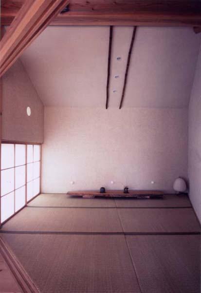 居間奥に配した変形の和室、天井は壁と同じ漆喰仕上げと工務店さんからいただいたスス竹