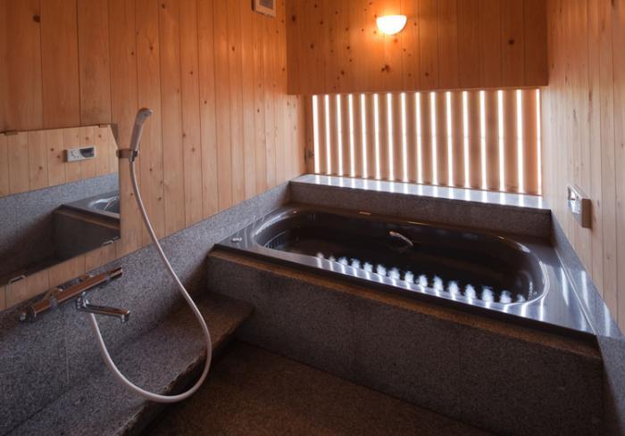 浴室・御影石と檜で仕上げる・内部から硝子戸、網戸、格子戸の順に全開する