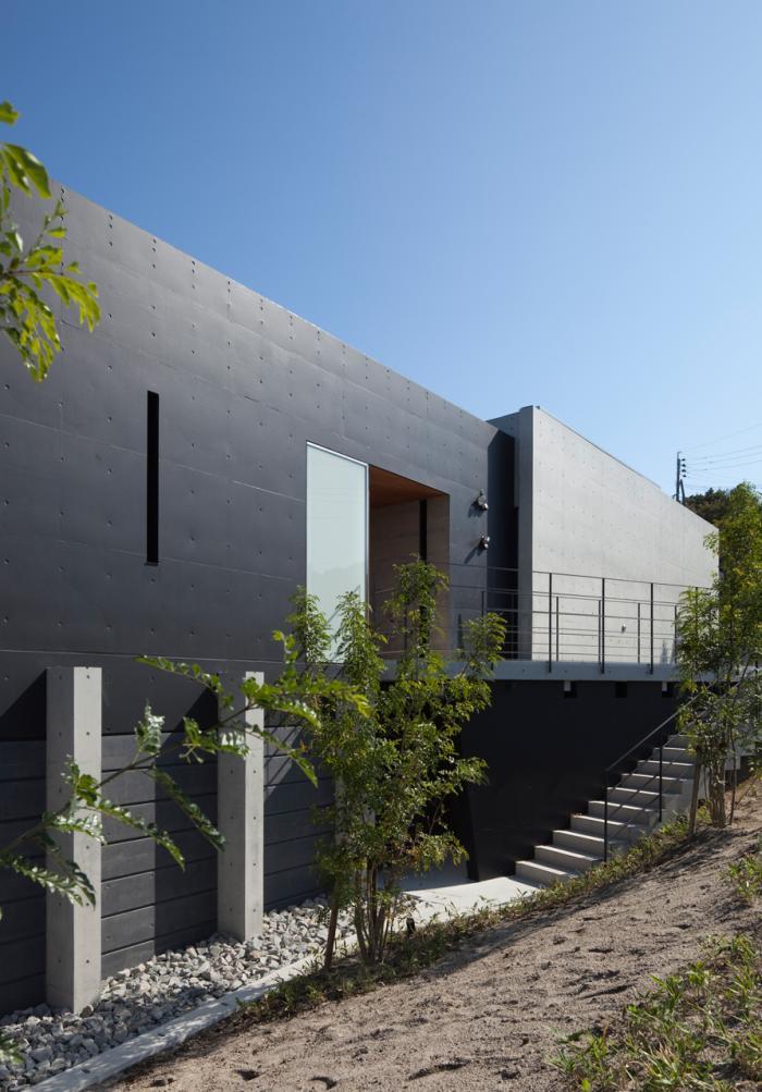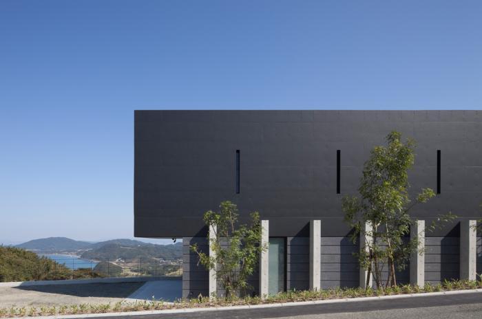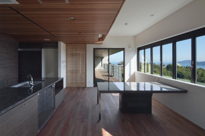 広大な敷地ですが、ほとんどが斜面で利用できるのは道路沿いのわずかな部分しかなく、また法により道路から5m以上離すことが義務付けられているため、道路に沿った細長い建物になりました。勾配がある前面道路の高い位置からブリッジで2階にアプローチします。道路より低い位置になる西側面は極力窓を設けず、海岸を見渡す東側に大きな開口を集中させました。ハードな印象のある外側に対し、内部は温か味のある空間に仕上げました。