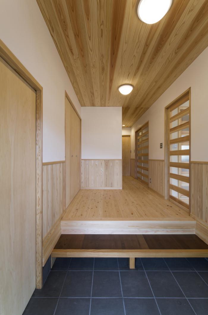 玄関 古材使用の式台、必要に応じて手すりが取り付けられる杉材仕上げの腰壁