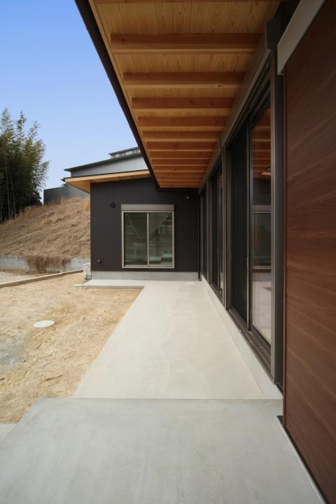 軒の深いリビングは南に梁を見せながら伸ばすことで、外を内に取り込むと共に、外と内との一体感を持たせました。和室を含めた個室はすべて南に向け、2階は屋根に乗れる程の大きめの窓を設置し、景色を感じられるよう工夫しています。バルコニーも防水が施されたものでなく、木で製作することで、全体の雰囲気を損なわないよう配慮しました。また、仕上に桧の床や真壁の珪藻土などを採用することで空間に落ち着きと懐かしさを求めています。