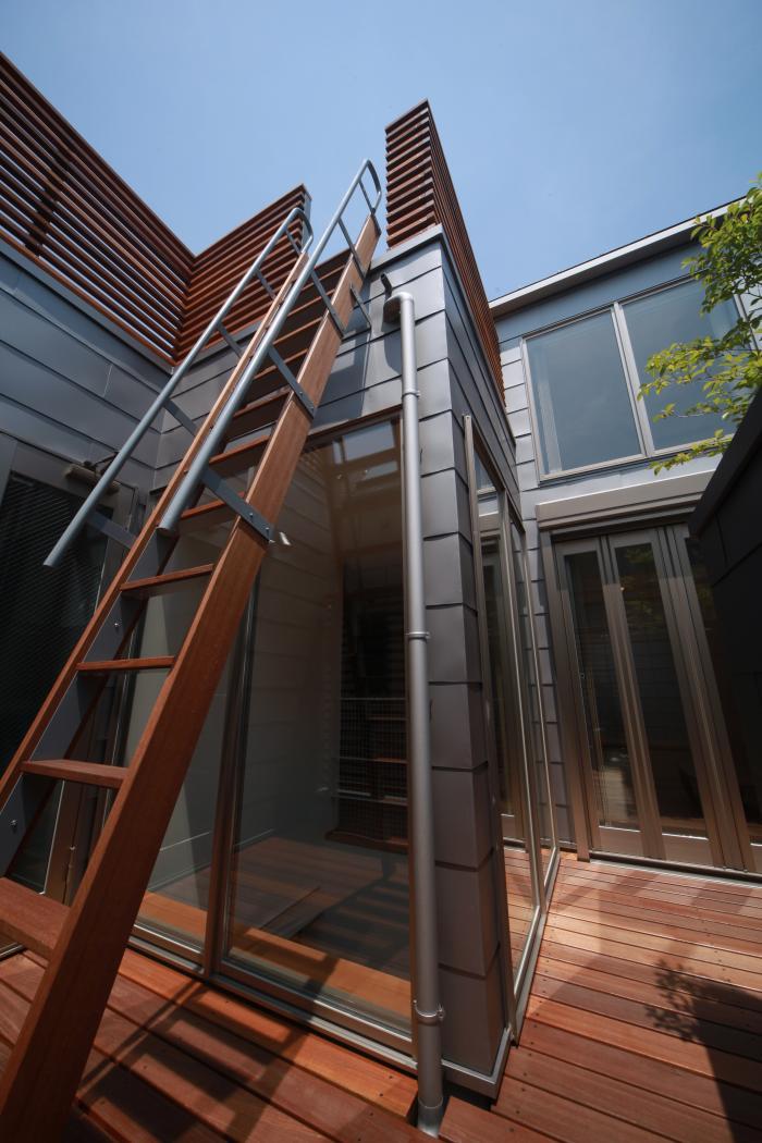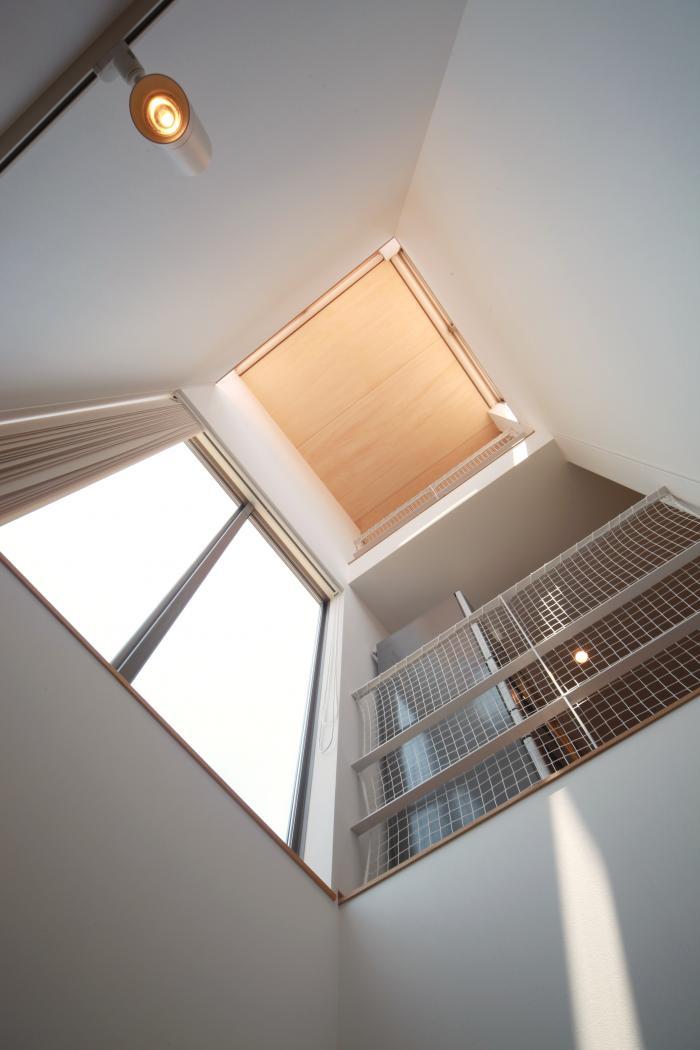 南側に3階建住宅が建つ、前面道路の狭い敷地でクライアントが望んだのは開放的で明るいガレージ付の住まい。南側は庭などのために空間を設けるのが定石ですが、この住宅では建蔽率のメリットを生かし、目一杯に寄せています。1階の採光は平面的には望めないため、各所に「光の筒」を挿入することで、空間に立体的な明るさを求めました。また、それと同時に1間(1820mm)2階部分を跳ね出すことで、狭い北側をすこしでも広く使いながら、2階の空間を確保しています。広がった建物は「光の筒」により光が降り注ぐと共に、視線が様々な場所で交わることで、家族の気配を感じ、筒を自然と見上げてしまうことで、開放感を得られるように考えました。