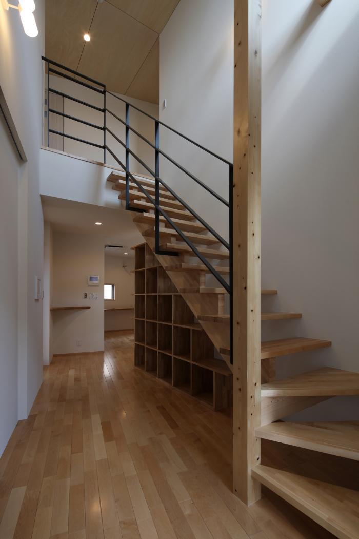 角地でもあり、ボリュームのある住宅です。地階から1Fにあがると、吹抜けからつながる階段ホールから、適宜に配置された横長の窓を通して外の景色が楽しめ、春になれば桜並木の借景も楽しめる気持ちの良い空間になっています。