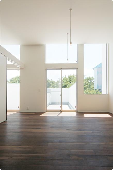 リビング:大開口やトップライトによって自然光を取り込み、天井の高い、漆喰による白い空間としました。