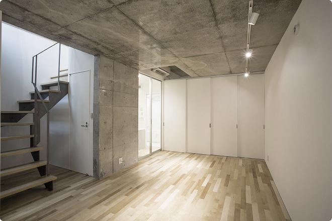 地下の賃貸スペースは、スタジオ・オフィス利用を想定して最大限広くワンルームとして使えるように計画、打放しを主としたクールなイメージを持たせました。
