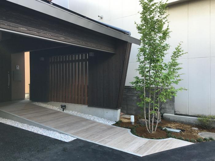 緩勾配のスロープとして木目調(ノコ目)のタイルを張っています。