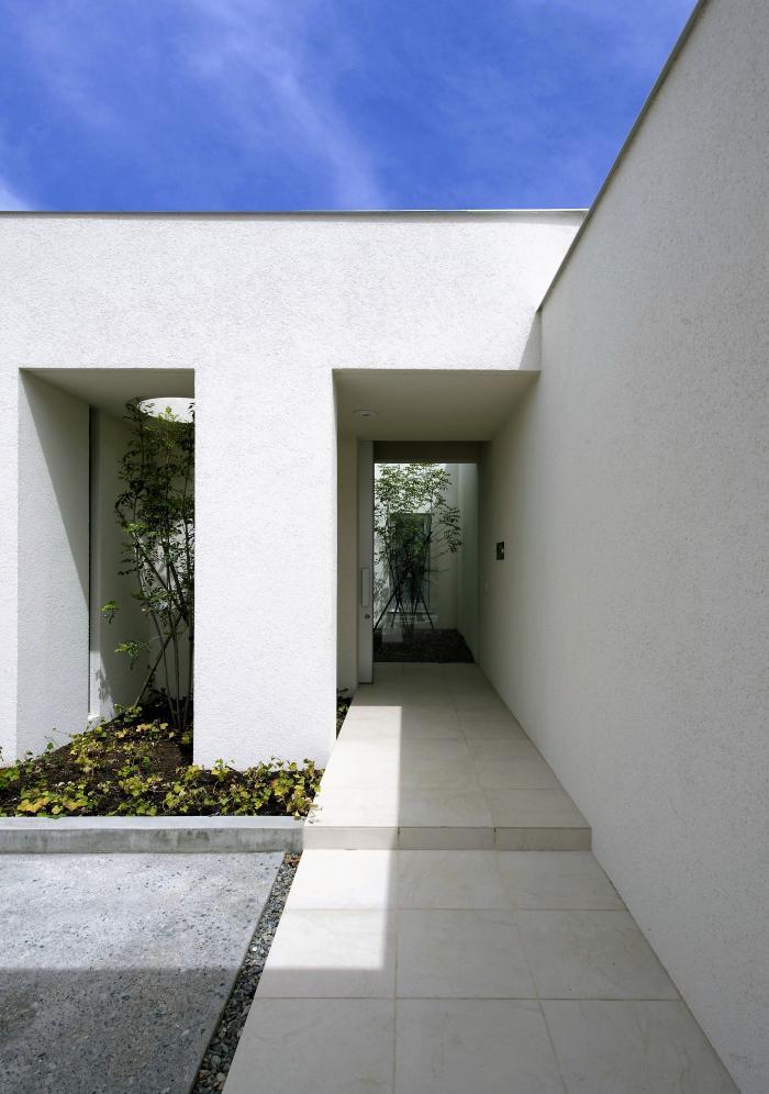 南北に長い敷地には南からガレージ、中庭1、ご両親の居住スペース、中庭2、子世帯の居住スペースと配置し、適度の距離感と採光風通し、緑で緩衝する空間をご提案しました。