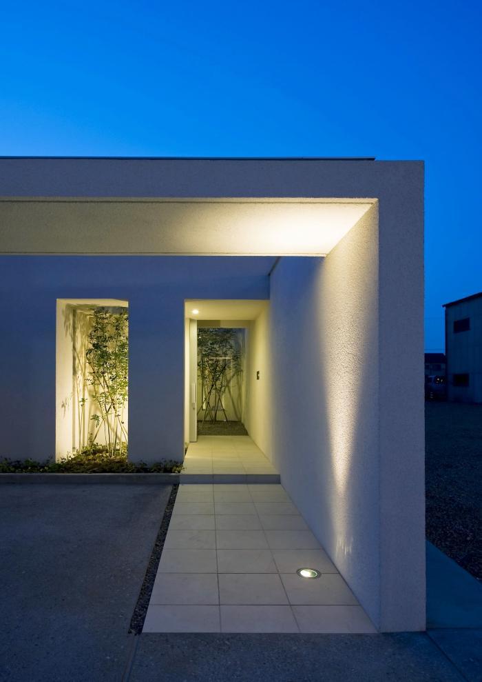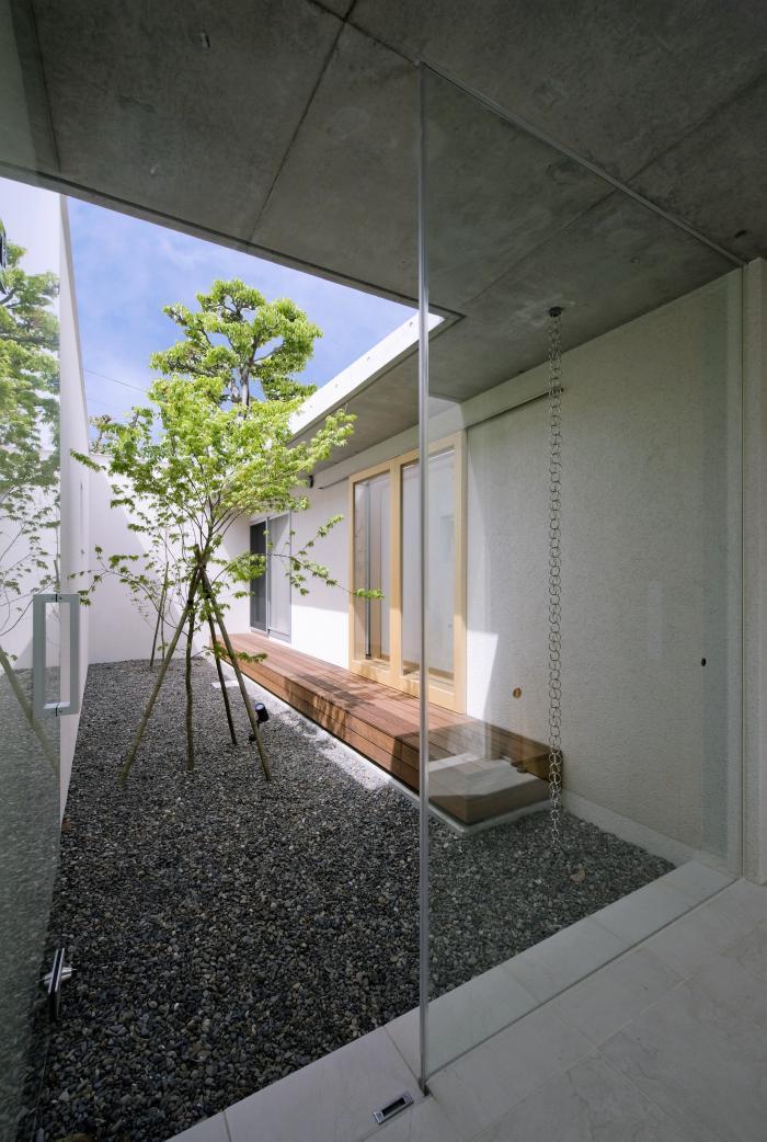 ガレージ~中庭~親世帯~中庭~子世帯と中庭を間にはめ込み光・風・プライバシーを上手に調整しています。