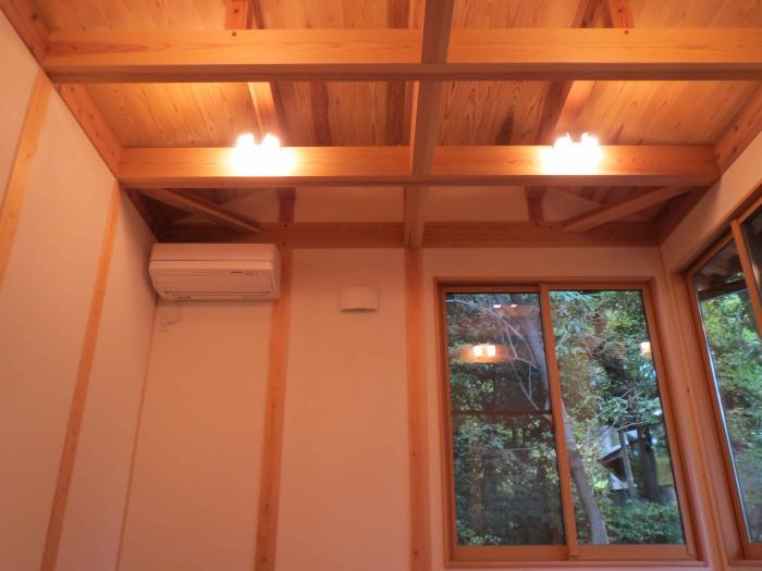 「木」を感じることができる勾配天井と梁の現しです