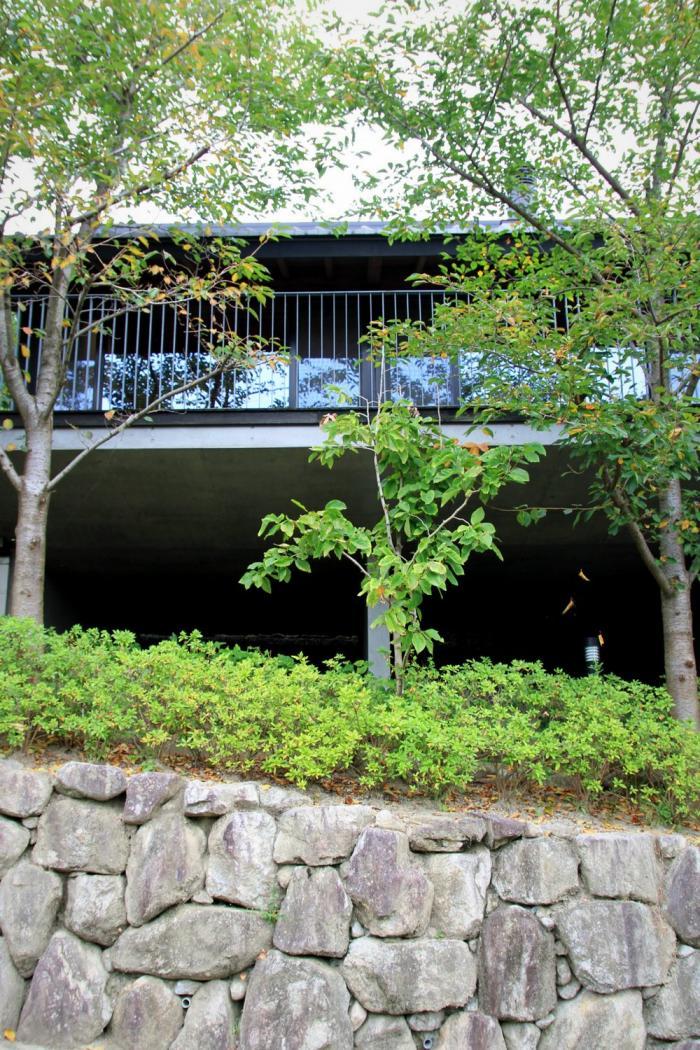 傾斜地の細長い敷地形状に合わせ、長さ約40mのゆるやかな弧を描く平面形が、連続するトップライトを持つ切り妻の瓦屋根によって覆われています。眺望の確保と、高いレベルで接道する前面道路との関係から、建物本体はピロティー形式の高床構造となっており、ずべての部屋はゆったりとした奥行きのある展望バルコニーに面してリニアに配置されています。