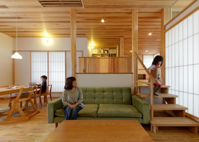 階段が建物中心を貫いており、スキップしてLDK、フリースペース、書斎(ソファー奥)とらせん状につながる。 独立した柱は階段コアを支える8角形柱。