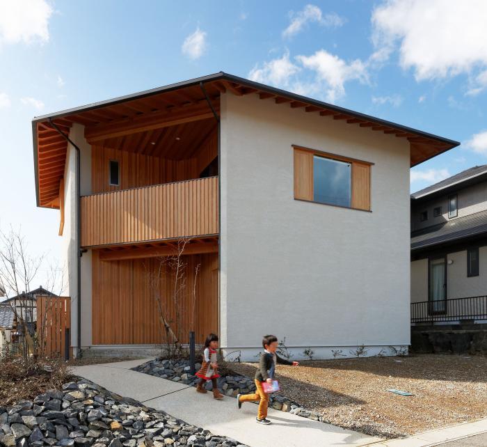 ふんだんに木を使っているが、雨掛りにならないよう軒や庇を設け耐久性を考慮し、左官仕上の外壁と合わせて日本の住宅にふさわしい内外観を形成することに腐心した住宅です。