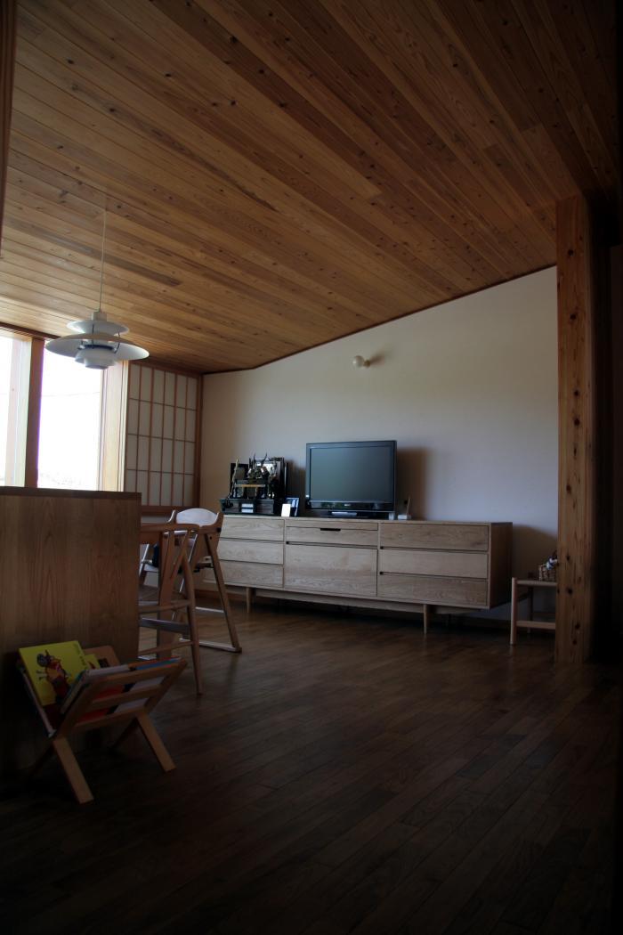 敷地段差は宅内で段差となり現れる。1階上段はコンクリートスラブ上に蓄熱床暖房を埋め込み、太陽光と薪ストーブの熱を集熱できる簡易パッシブソーラーとなっている。