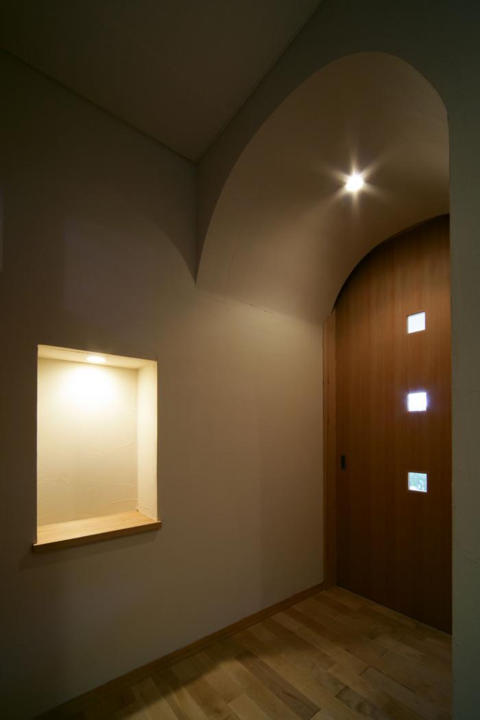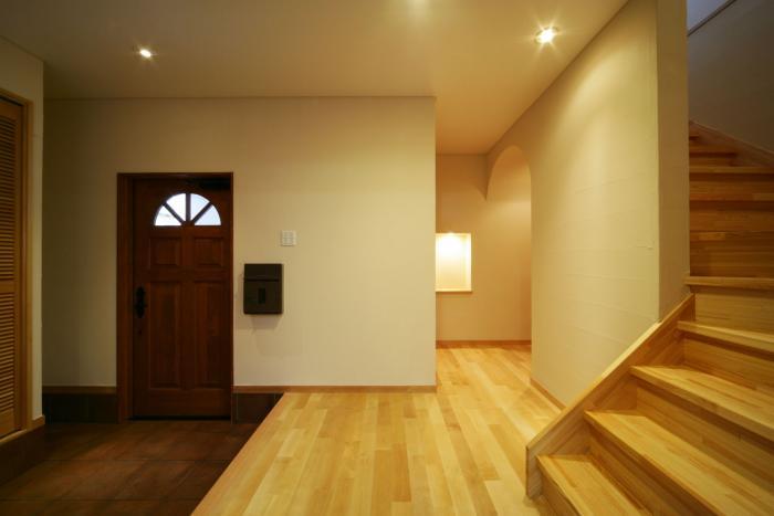 来客が多いので、かなり広い玄関。ドアは無垢なので、雨がかからないようにポーチは深くしている。