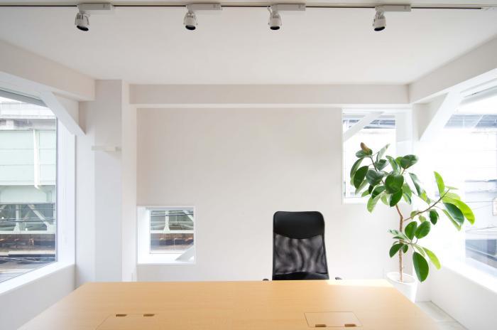 駅前不動産屋の1階の接客室です。築50年の鉄骨造地下1階、地上4階建て建物をリノベーションしました。1、2階のラスモルタルの外壁を取払い構造補強した上に耐火塗料で被覆としてガラスをかぶせ開放的で明るい店舗、オフィスと変身しました。