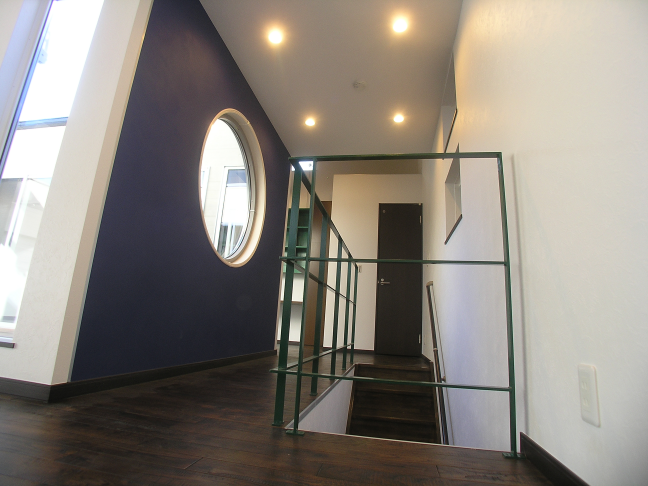 2階リビングでインナーテラスを配置した家です。階段の上にはアクセントになるビビッドな色の丸窓がついた壁があります。