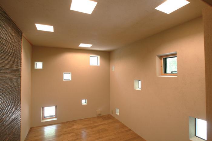 塔1階の壁は主要な耐震壁の役割を担っている。大きな窓は開けられず開口部はポツ窓とし、天井照明も同じような形で造り、塗壁仕上げで穴倉のような空間にしている。