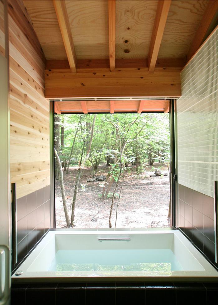 浴室の建具は全開できる。全開すれば垂木の屋根の下の露天風呂となり林を眺めながらの入浴ができる。