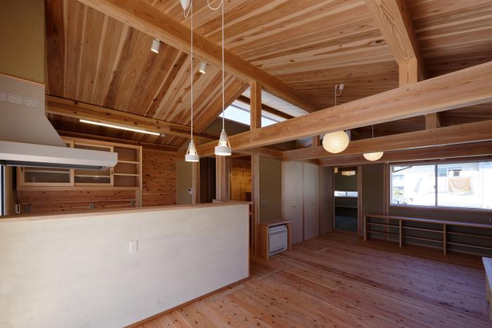 ローコストなシステムキッチンを大工造作に組み込んで、木組みの家と調和させています。