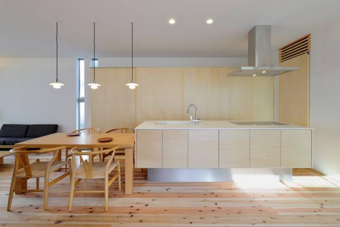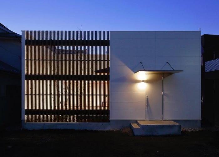この家は「普通のコートハウス」を目指して作成しました すべての居室が中庭に向かい、中庭面が全面開口となる基本的なプランです 外側を囲うことでプライバシーが保たれ(カーテンの役割が外部のルーバーの位置に移動することで)内側のウィンドウトリートメントが不要になるだけの単純な仕組みです ルーバーを縦格子とすることで見えていい部分と見せたくない部分のコントロールを間取りと合わせて行っています このプランの主役は屋外(庭)にあります 家の中は常に動きはありませんが、屋外は光や風によって常に変化し、どちらが気持ち良いかは明らかです そのため、住宅としてはいかに屋外に視線を移動させるかのみ注力すればこの家は完成に近づきます 上記を踏まえ、天井、壁、床を構成し、結果として間接照明を用いる形になりました 今回は二つの中庭を設けました 同じサイズなのですが、同じサイズに決して見えないことは自分にとっても良い発見でした いつもは回遊動線にこだわって作っており、今回は平面プランが先行し回遊にはならなかった、と個人的に思い込んでいたのですが よく見てみたら浴室とトイレ以外玄関や子供部屋を含めて全ての部屋が行き止まりにならない形であったことを先日発見し、自分の無意識な頑固さに呆れました 同時にプランの末端で小さく回転するだけでも閉塞感はなくなり、通り抜けできるという思い込みだけで安心できる間取りであったと思います 廊下は最小限に、ちょっと出来てしまった廊下も和室の広縁代わりに、と余すところなく広さを使いきりました コートハウスの真骨頂は方位性を失えるところだと思っています、これはこのプランがどういう角度で回転しても(南北が逆になっても、東西と南北が入れ違っても)成立する間取りだと思うのですが、初期の段階からここだけは意識しながら作ったプランです 方位性を失う、ということは同時に部屋ごとのヒエラルキーというか重さ感覚も無くなった方が回転した時にも成立しやくすなることから、各部屋には同じ重さの力を与えているつもりです これは感覚的なものですが、見学会で来客にリビングで説明できる量と子供室や寝室や水回りでの説明量がなるべく同じになるくらい負荷を与えているという作り方です なので、施主のライフスタイルや要望に基本は合わせていますが、部屋のヒエラルキーを平滑にする目的上、ロフトは必要であって、寝室も和室であるべきで、洗面も開放的であるべきと思い結果としてこのような家になりました 設計:ポーラスターデザイン一級建築士事務所 施工:株式会社イケダ工務店 造園・外構:装景NOLA 写真:富野博則(一部長澤徹)