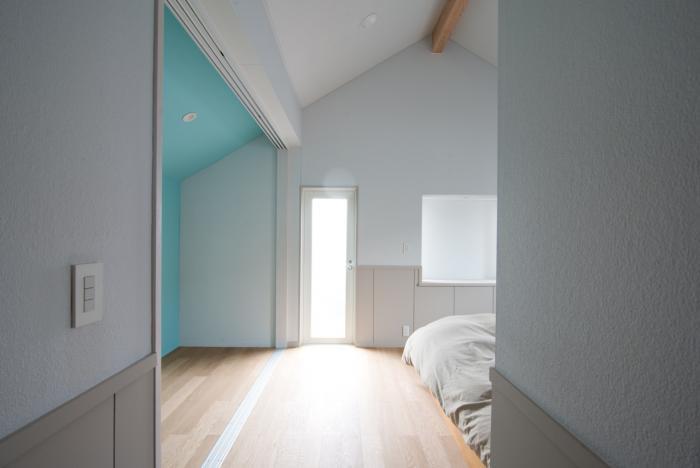 シンプルな漆喰の部屋と色を使った各部屋を区分けしてどこにいても楽しめる空間にした。