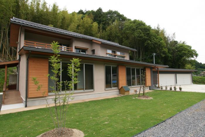 中庭や別棟ガレージのある共有型二世帯住宅です。和モダンの風情を感じさせる、瓦、自然素材の塗り壁、軒天や雨戸戸袋に杉板を張っています。