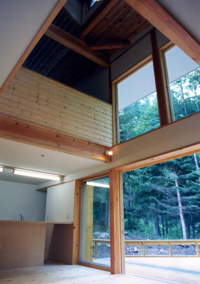 土地の高低差をそのまま活かし、スキップフロアの構成とした。玄関、LDK、客間とトイレ、仕事場と寝室と4つの床レベルとなっている。吹き抜けを中心とし、客間と水廻り以外は壁のないワンルームの空間である。庭に面する開口部は全開出来る木製の引き込み戸とし、室内を広いデッキテラスへ連続させている。
