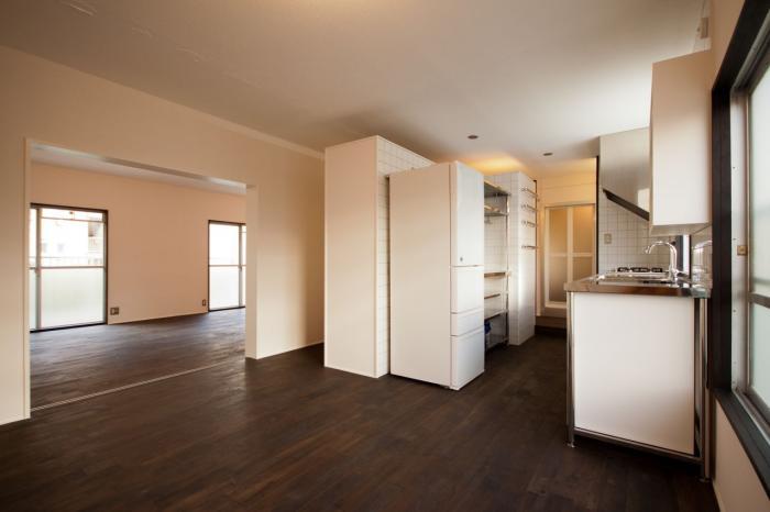 長岡京市、竹の台団地の改装です。自由でシンプルな暮らしを望まれるお客さんの生活哲学に合うようにしつらえました。取り除ける間仕切りは全て取り払い、使い方を限定しない大きなワンルームとしています。それに合わせ、壁と天井は白くフローリングは黒に統一しニュートラルな空間に仕上げています。その中でも奥様が長く居るキッチンは密度を上げてしつらえました。キッチンユニットは奥様がファンの石黒智子さんのキッチンを模したオーダーメイドキッチンです。