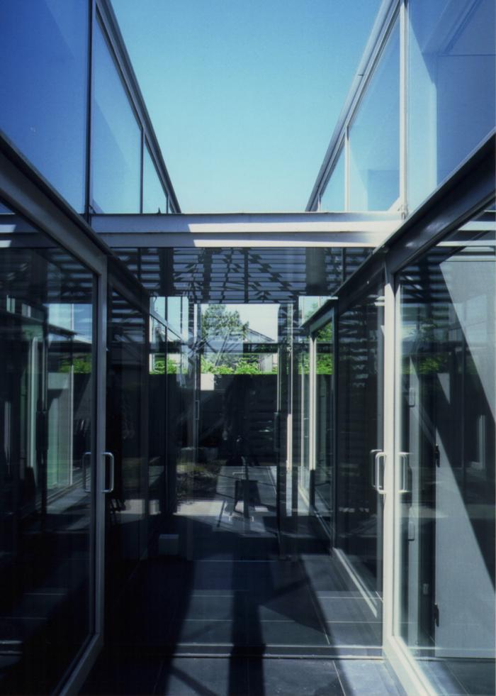西斜面に跳ね出すようにしてパラレルに居住空間を配置し、中央にアプローチを兼ねた外部空間を貫入させた。長辺方向をすべてガラスで構成し、西の緑をすべての部屋に映し込んでいる。アプローチ手前側にアトリエ、奥に住居を配置し私的性を高め、床は全面タイル張りとし、空間に連続性を持たせた。このタイルが持つ厳密なモジュールとシャープなエッジが、均質な水平の「面」として強調され、マットな質感は、空間全体に落ち着きを与えた。