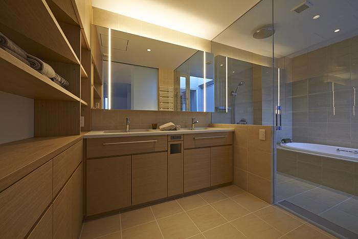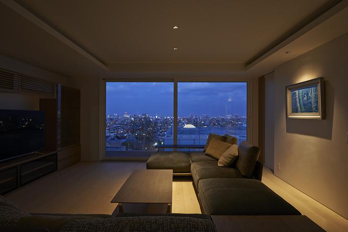 車庫棟に続き、地下に住宅の玄関があり、1階には庭と同レベルのウィンターテラスと呼ばれる半屋外空間・ご主人の趣味の空間・客間が並ぶ。生活の主たる空間は2階に集約され、リビングからは市街が一望できるようになっている。階段はそれらを縦に繋ぎ、階ごとに異なるシーンが展開していくよう配置されている。