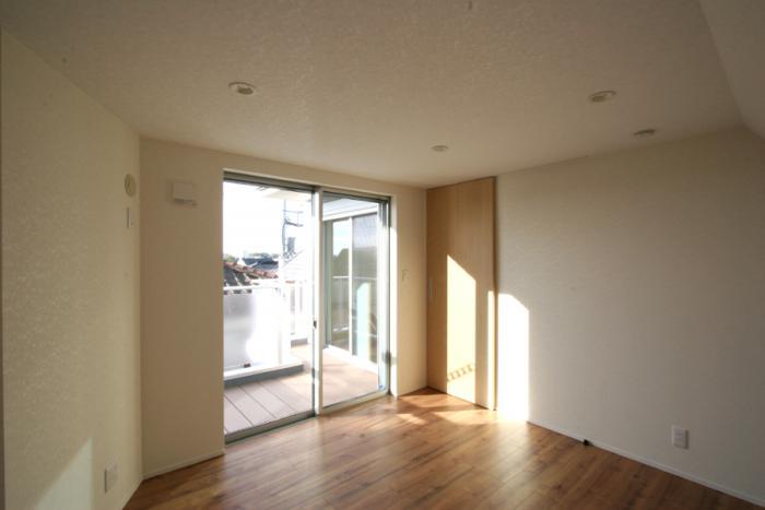ステンドグラス工房付の賃貸併用住宅のご希望に対して、南東角に設けた光庭を中心として、掃出し窓を介したバルコニースペースをL型状に取り囲むように各部屋を配した構成を気に入られ、設計を依頼されました。