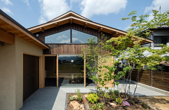 格子の引き違い戸の玄関は杉板張で仕上げ,上品な色の塗り壁にアクセントを添えています.玄関ポーチから繋がる丁寧に作庭されたお庭は生活に彩りを与えてくれます.