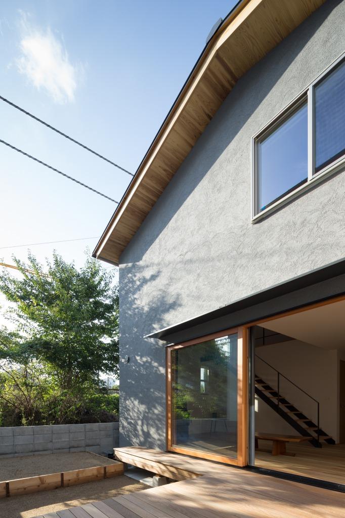 道路に対しては平屋のボリュームで低く構え、玄関先に深い軒下に配置。アプローチに沿って植栽を設え、控えめで静かな佇まいとしました。