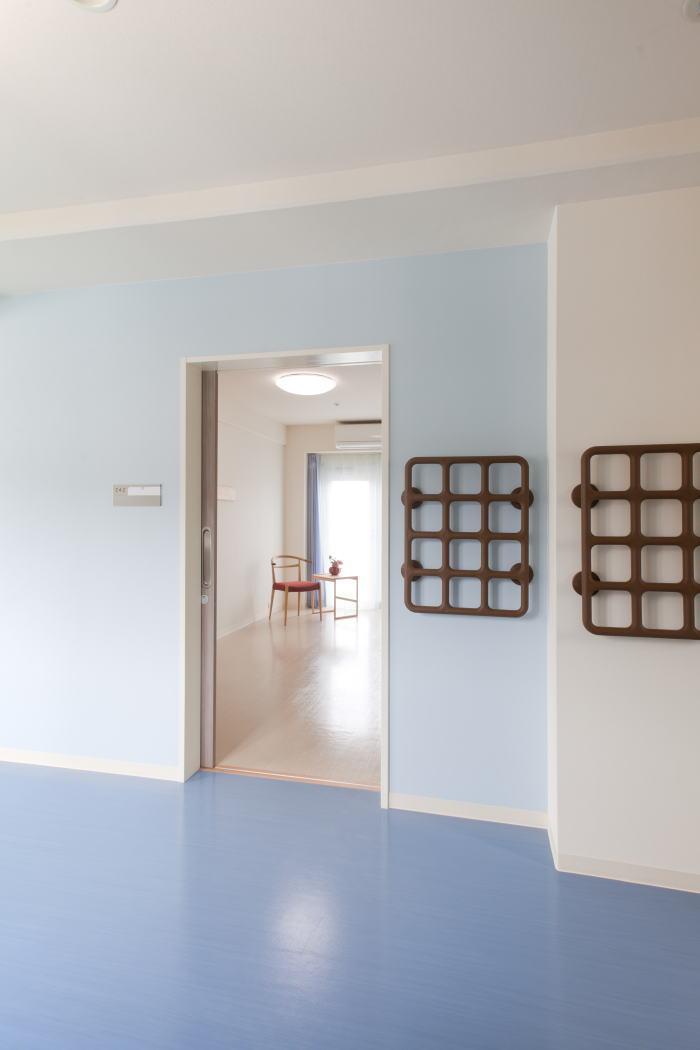 施設利用者が楽しく暮らせるように、個室や共用部分には遊び心のある色彩計画やデザインを採り入れており、また、「機能を満たすだけの建物ではなく、地域に貢献できるような建物にしてほしい。」というお施主さんの想いがあったので、1階の大半を共用スペースとし、娯楽教室やイベントなどに地域の人が参加できるようにしています。