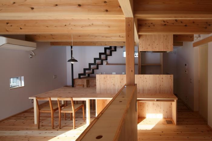 おおらかに繋がる空間の隅に階段を設けていますが、キッチン家電棚の上を通過することになります。階段からの埃が落ちることに配慮して蹴込み板(垂直面)にはアクリル板を嵌めています。