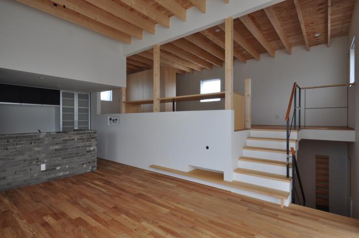 LDKとの境の壁を無くし一体空間としつつ、雑多になりがちな子供室を半階のズレにより目線から隠しす工夫をしている。